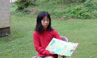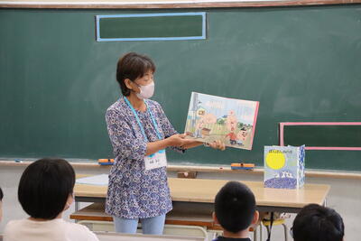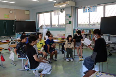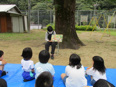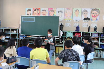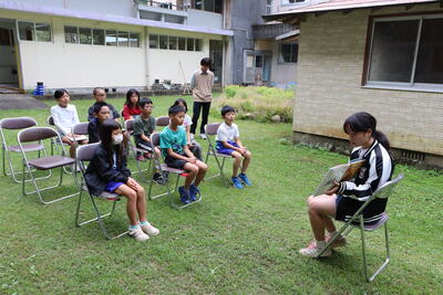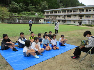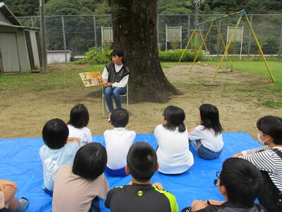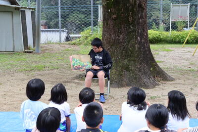 運動場と中庭に分かれて、6年生による読み聞かせを実施しました。