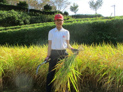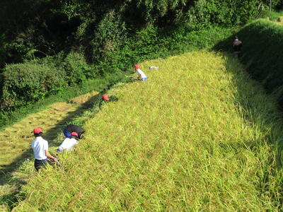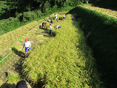 秋晴れのもと、古園地区にお住まいの岩本尚格さんの田んぼをお借りして稲刈りをさせていただきました。