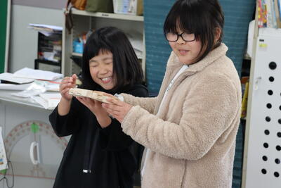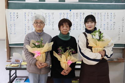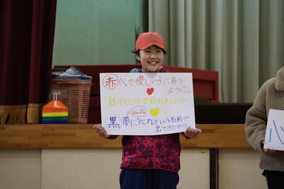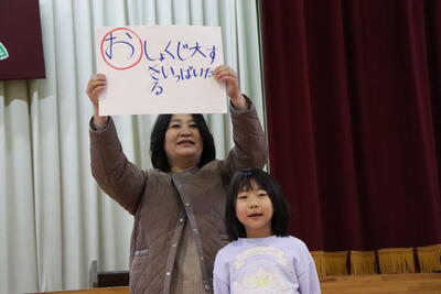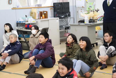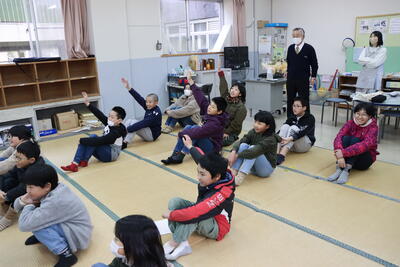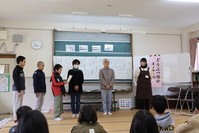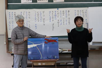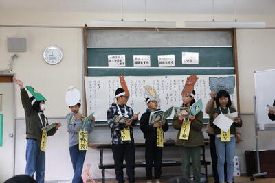3月8日(金)読み聞かせボランティアの津隈さん、工藤さん、図書活動推進員の山本先生に来ていただき図書感謝集会を実施しました。津隈さんや工藤さんが準備してくださった「参加型読み聞かせ」を体験したり、これまでの活動に対して感謝を伝えたりしました。