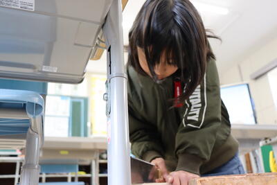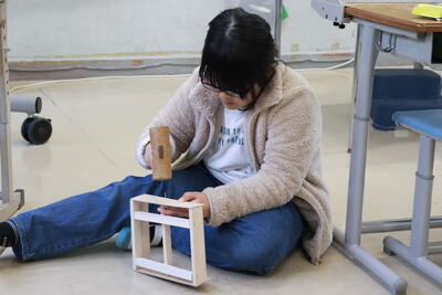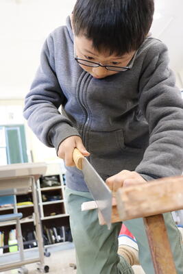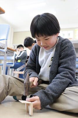3年生が、のこぎりと金づちを使って作品を作っていました。