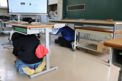 放送をしっかり聞き、それぞれの場所で一次避難、揺れが収まった後、運動場へ二次避難しました。一次避難では、安全な場所を自分で探してその場でしゃがんで待つ姿や机の下に潜って避難する姿が見られました。