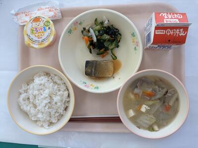 麦ごはん 豚汁 さばゆずみそ煮 きゅうりの塩もみ 豆乳プリン 牛乳