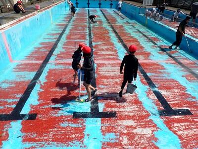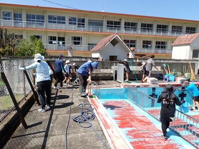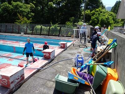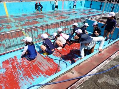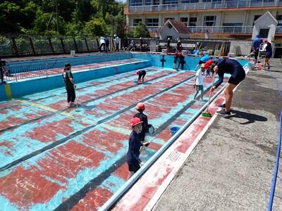 6月5日(木)全校児童でプール清掃を行いました。保護者の方々も多数お手伝いに来ていただきました。おかげでとてもきれいになりました。ありがとうございました。とても暑い日だったので、休息を何度も取りながらの清掃でした。プール開きは6月17日(火)の予定です。