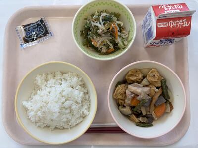 麦ごはん 筑前煮 茎わかめの酢の物 給食のり 牛乳