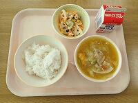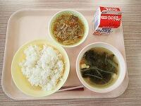 今日の給食は、春雨スープです。今日のスープに入っている春雨には、大きく分けて2種類あり、「でんぷんはるさめ」と「緑豆はるさめ」に分けられます。今日のスープに使っているのは、緑豆はるさめです。緑豆はるさめは、緑豆という豆のでんぷんから作られています。でんぷんはるさめと比べて、コシがあり、つるりとした食感が特徴です。