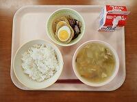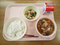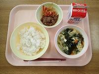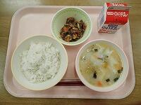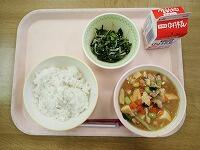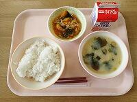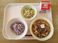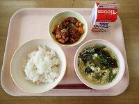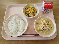 麦ごはん 牛乳 豆腐と卵のスープ 鹿と豆のケチャップ炒め