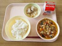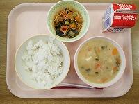 いもの仲間には、じゃがいも、さつまいも、さといも、やまいもなどがあります。いもにはビタミンCが多く含まれており、しかも、いものビタミンCは加熱してもこわれにくいというよいところがあります。しかし、最近ではいもを食べる量がとても少なくなってきているといわれます。ビタミンCは果物にも多く、病気をやっつける働きがあります。そのためフランスではじゃがいものことを”大地のりんご”というそうです。今日は今が旬の新じゃがを使ったそぼろ煮でした。