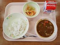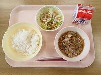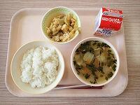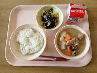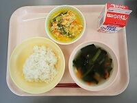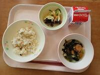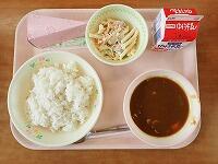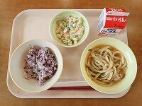 減量わかめごはん 牛乳 カレーうどん 豆とチーズのコロコロサラダ