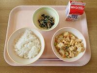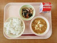 給食では、たびたび豆の料理が登場します。豆は、植物の種ですね。この種を土に植えて、水をかけると、植物が育ちます。つまり、豆には生きる力がたくさん詰まってます。植物には、人間の体ではつくることができない栄養素、ビタミンをつくることができます。人間が体の中でエネルギーをつくるためには、このビタミンが必要です。今日は、豆の中でも大豆が姿をかえた、豆腐を使ったマーボー豆腐でした。