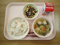 麦ごはん 牛乳 豆腐と小松菜のスープ 鶏そぼろ丼の具
