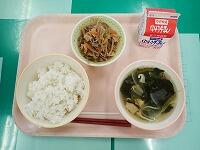 麦ごはん 牛乳 牛肉の大和煮 きゅうりとちりめんの酢の物