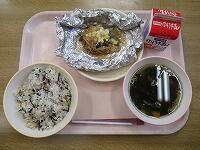 今日は春の味覚たけのこですたけのこは硬く、えぐ味が強い野菜です。そこで、たけのこの皮をつけたまま米のとぎ汁で1時間ほど煮ます。たけのこの皮にはえぐ味をとる働き、こめのとぎ汁にはたけのこをやわらかくする働きがあるからです。たけのこはエネルギーが低く食物繊維がたくさん含まれ、体によい野菜ですので、家庭でも今日のようなたけのこごはんにしたり、汁物や煮物、和え物など様々な方法で食べてみてください。