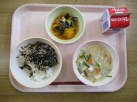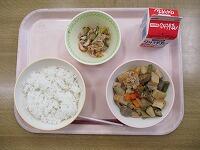 たけのこごはん 牛乳 いわしの甘露煮 きゅうりもみ 根菜のごま汁