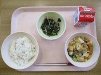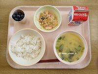 麦ごはん 牛乳 魚と豆のケチャップ炒め 豆腐と卵のスープ