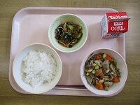 麦ごはん 牛乳 炒り豆腐 きゅうりとえのきのピリ辛和え