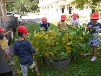 10月15日(火)今週、学年ごとに大豆の収穫をしています。プランタやプール横の畑ではうまく育ちませんでしたが、中庭の畑にはたくさんの大豆が実を付けました。少しずつですが一人ずつおうちへ持って帰りますので、ぜひご家族で召し上がってみてください。