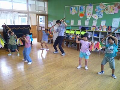 7月4日(金)この日のクラブ活動は、場所を祇園テラス鞍楽(旧鞍岡中学校)に移動して、竹鉄砲づくりを行いました。地域の方2名を講師としてお招きし、分かりやすく教えていただきました。一人一人が竹鉄砲を作り、濡らした新聞紙を詰めて飛ばして楽しく遊びました。