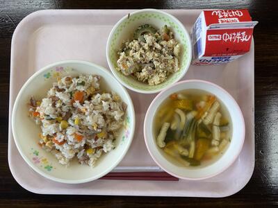 今日は七夕です。七夕汁にの中に天の川に見立てたそうめんを入れて、星形のおくらが入っています。コーンご飯もキラキラ輝く星が夜空にたくさん浮かんでいる様子を表しています。