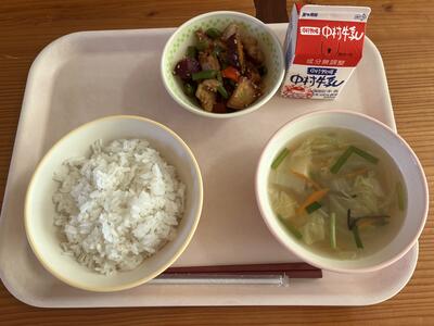 麦ごはん もずくスープ 豚肉のソース炒め 牛乳
