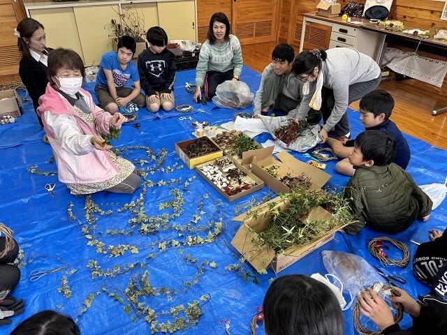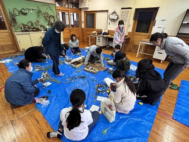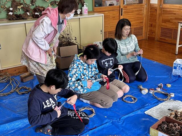 11月28日、クラブ活動として、4・5・6年生が地域の方々の協力を得て、クリスマスリースづくりとしめ縄づくりを鞍楽(くらら)で行いました。