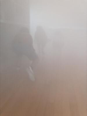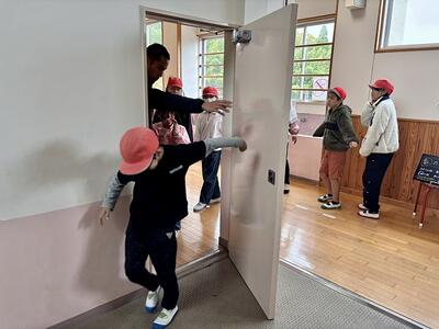 11月26日、火災発生を想定した避難訓練を行いました。写真は、校内で煙が蔓延した場合の視界の悪さを体験し、避難の仕方を練習しているところです。煙の中ではほんの少し前もほとんど見えませんでした。