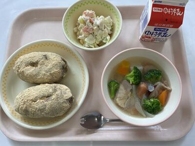 麦ごはん 五目豆腐スープ 鶏肉とさつま芋の揚げ煮 牛乳