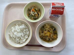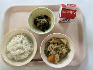 今日の給食は、ご飯、魚の煮物、和え物、汁物という「和食」です。平成25年に、「和食」がユネスコの無形文化遺産に登録されました。世界中が和食に注目しています。それは、日本では、季節や地域ごとに、新鮮な食材を生かした料理が昔から作られてきたことが魅力の一つです。みなさんは、春夏秋冬の四季があるのは、日本だけということを知っていましたか?季節の移り変わりがあることで、四季折々のいろいろな食材が収穫されます。また、昆布や煮干しからとっただしには「うまみ」がたっぷりでています。その「うまみ」を使って汁や煮物を作るため、おいしさが増して味付けに使う調味料が少なくて済みます。薄味でいつまでもあきのこない味に仕上がります。この「うまみ」は他の国にはない食文化です。日本特有の食文化を受け継いでいきたいですね。