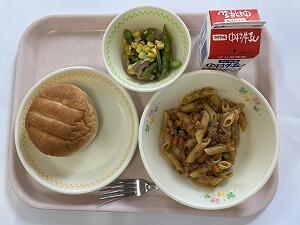 米粉パン ペンネボロネーゼ アスパラソテー 牛乳