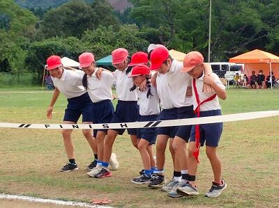 徒走、団技、応援!みんな全力です。とても暑い日でしたが、1年生が1学期に収穫した梅で作った「うめジュース」を飲み、元気が出ました。