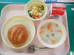 今日は、給食用に無償で提供していただいたホタテを使ったクラムチャウダーです。クラムチャウダーは、アメリカで親しまれている具材がたっぷり入ったスープのことです。クラムチャウダーの「クラム」は英語で二枚貝を意味していて、「チャウダー」は貝、魚、肉、鶏肉を中心として、ベーコン、じゃが芋、玉ねぎといった野菜を煮込んだスープを指します。クラムチャウダーとシチューは、ほぼ同じ料理のように思っている人もいるかもしれませんが、クラムチャウダーはシチューほどとろみは無く、具材も大きくないのが特徴です。