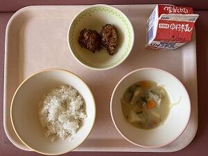今日は、すっかり人気メニューになった「たこ焼き揚げ」の登場です。給食室にはたこ焼きを作る機械がないので、たこやちくわ、キャベツ、にんじんなどの野菜を小さく刻んで、小麦粉や卵でまとめて、ひとつひとつ手で丸めて油で揚げています。揚げた物にソースをからめてかつお節と青のりをふりかけています。普通のたこ焼きもおいしいですが、給食のたこ焼き風かき揚げも、かりっとしていて、野菜たっぷりで、愛情がこもっていておいしいです。