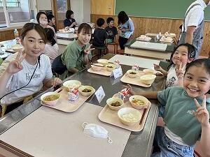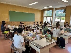 おうちの人にはいつも児童が食べている給食の量や、様子を見ていただきなががら、本校のおいしい給食を食べていただきました。