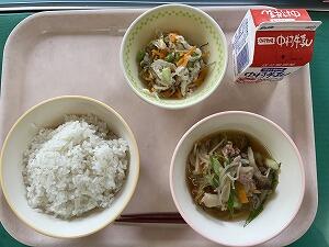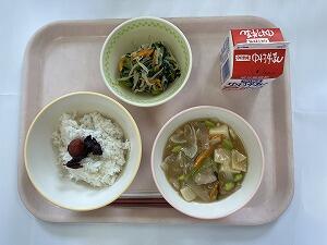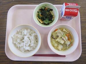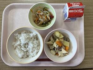 今日の給食は、ご飯、煮物、和え物、汁物という「和食」の組み合わせです。平成25年に、「和食」がユネスコの無形文化遺産に登録されました。世界中が和食に注目しています。日本では、季節や地域ごとに、新鮮な食材を生かした料理が昔から作られてきたことが魅力の一つです。それぞれの季節にとれる旬の食材を使い、昆布や煮干しからだしをとり、だしのうまみで汁物や煮物を作ります。この「うまみ」というものも他の国にはない食文化です。自然を大切にしてきた人たちの食文化を私たちも受け継いでいきたいですね。