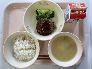 麦ごはん 千切り大根のみそ汁 釜入り茶とひじきのハンバーグ ブロッコリー 牛乳