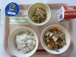 麦ごはん 鶏肉と里芋のみそ煮 きゅうりとえのきのピリ辛和え ヨーグルト 牛乳