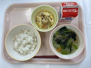 麦ごはん 豆腐と小松菜のスープ 鶏そぼろ丼 牛乳