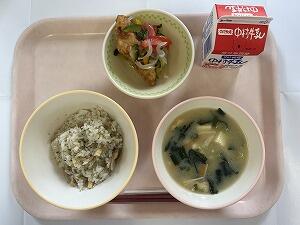 千切り茶めし なすのみそ汁 魚のエスカベッシュ 牛乳