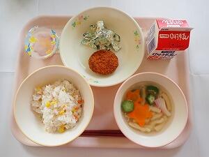 7月7日は、七夕です。七夕は、中国から伝わった行事の一つです。「7月7日の夜に天の川にかかる橋を渡って、織姫と彦星が1年に1度だけ会うことができる」という伝説にもとづいたお祭りです。七夕の行事食には「そうめん」があります。これにはいろいろな説がありますが、機織りの上手な織姫のつむぐ“糸”や“天の川”に見立てて食べられているようです。給食では、七夕汁の中にそうめんを入れて星型のオクラを入れています。コーンごはんもきらきら輝く星が夜空にたくさん浮かんでいる様子にも見えませんか?今日は天の川が見られるといいですね。