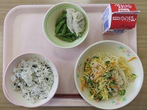 減量わかめごはん 冷やし中華 餃子 枝豆 牛乳