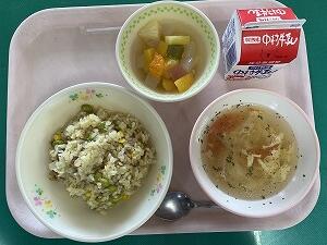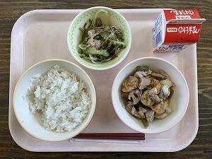 今日は春の味覚たけのこです。たけのこは、その名のとおり竹の子どもですが、成長が早いため10日ほどで竹になってしまいます。また、たけのこを食べるには少々手間がかかります。たけのこは硬く、えぐ味が強い野菜です。そこで、たけのこの皮をつけたまま米のとぎ汁で1時間ほど煮ます。たけのこの皮にはえぐ味をとる働き、こめのとぎ汁にはたけのこをやわらかくする働きがあるからです。たけのこはエネルギーが低く食物繊維がたくさん含まれ、体によい野菜ですので、今日のように混ぜご飯にしたり、煮物や和え物、汁物にしたり、様々な方法で食べてみてください。