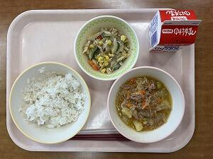 麦ごはん カレー肉じゃが ひじきの洋風白和え