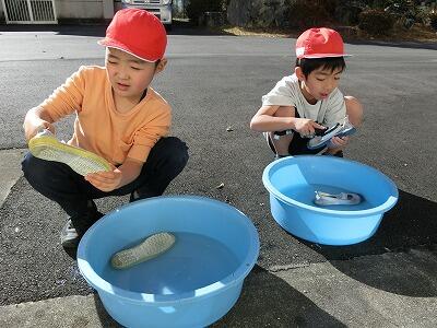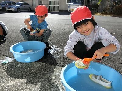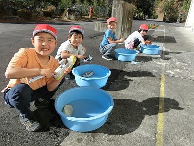 みんな、シューズを自分で洗ったのは初めてでした。たわしに洗剤をつけて一生懸命にこすると、「うわっ、すごく白くなる。」とみんな驚いていました。これからお家でも、自分で洗えるといいですね。