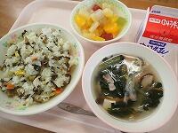 今日の高菜チャーハンの中には「ちりめん」が入っています。「ちりめん」とはいわしの赤ちゃんのことで、「ちりめんじゃこ」とか「しらす干し」とも言われます。一般的には生のしらすをゆでた物を「釜揚げしらす」それを干した物を「しらす干し」、さらに乾燥させた物を「ちりめん」と呼んでいます。給食ではいつも宮崎県産の物を使っています。カルシウムたっぷりのちりめんが入ったチャーハンでした。