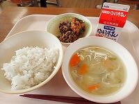 麦ごはん 牛乳 じゃがいものそぼろ煮 白菜のおかか和え Soyかけ