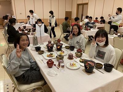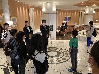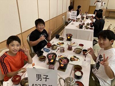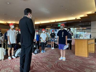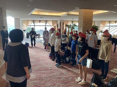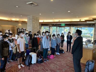 ホテル日南北郷リゾートに無事到着し、入館式を行いました。みんなとっても元気です。ホテルでの夕食や友達と部屋で過ごす時間が、とても楽しみなみんなです。