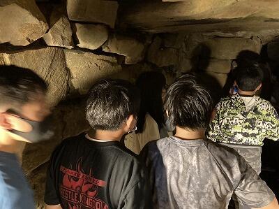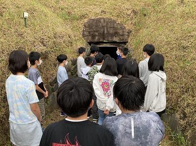昼食後は宮崎市に移動し、赤江特攻慰霊碑・掩体壕にて平和学習を行いました。戦争当時の話を聞きながら、平和の尊さについて改めて考えることができました。