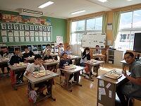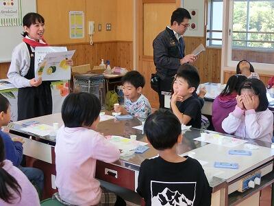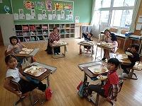 味の種類や目や鼻、耳などの五感を使って味を感じることの大切さについて教えていただきました。授業の中ではいろんな味を実際に目をつぶって感じる活動もあり、子ども達は口に入れると、「あまい~」「すっぱい!」など元気に答えていました。