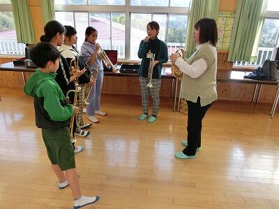 10月25日(水)鼓笛練習の時間に、五ヶ瀬町役場からお二人の方に来ていただいて、トランペットの吹き方について指導していただきました。