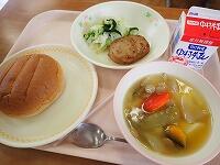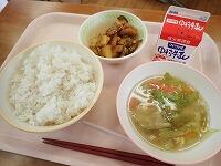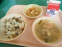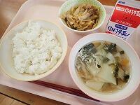 麦ごはん 牛乳 レタスと卵のスープ 鶏肉とゴーヤの揚げ煮