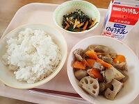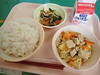 高野豆腐は、豆腐を凍らせた後に乾燥させて作ります。日本に昔から伝わる保存食の1つで、今から約800年前に考えられたといわれています。大豆からできているので、たんぱく質やカルシウムが豊富で、骨や歯を丈夫にし、筋肉をつくるもとになる食べ物です。今日は野菜などと一緒に煮て卵でとじました。他の材料のうま味がぎゅっとしみ込んだ高野豆腐を味わっていただきましょう。今日の甘酢和えにも3年生が育てたパプリカを使用していただきました。